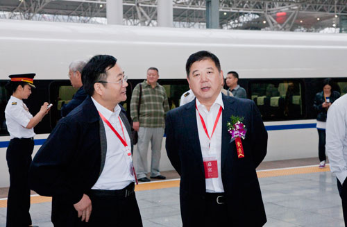 经过中铁四局等单位建设者历时40个月的艰苦建设,合(肥)蚌(埠)铁路客运专线于2012年10月16日正式投入运营。在今天上午举行的合蚌客专动车组首发仪式上,安徽省委副书记、省长李斌,安徽省委常委、常务副省长詹夏来,铁道部副部长胡亚东,上海铁路局局长安路生等出席开通仪式并剪彩。中铁四局董事长、党委书记张河川,中铁四局副总经理闫子才及部分参建者代表见证了这一历史时刻。