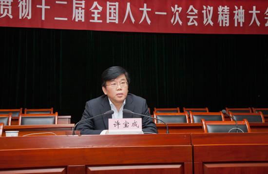 报告会上,许宝成就会议的基本情况、会议主要任务、会议组织情况向作了简要介绍,并就会议主要精神进行了解读传达。许宝成在讲话中指出第十二届全国人民代表大会,是在全面贯彻落实党的“十八大”精神的开局之年、实施“十二五”规划承前启后的关键之年召开的,会议有两大显著特点:一是紧扣“十八大”主题;二是释放改革强音。许宝成向与会人员重点传达了政府工作报告、国务院机构改革和职能转变方案两个文件的主要内容和精神,着重介绍了“大部制”改革的主要目的和主要内容以及铁道部撤销后的职能划分情况。