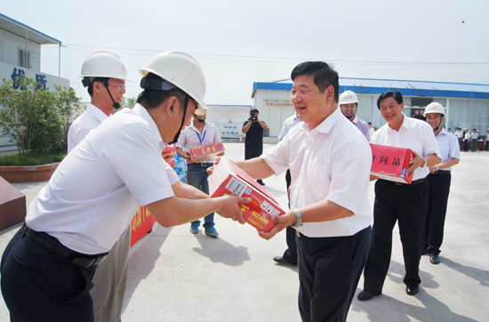 会前,局领导来到协作队伍员工中,为他们送上消暑饮料、西瓜等慰问品,并要求梁场领导采取调整作息时间、提供防暑用品等措施,确保项目施工安全、人员身体健康。
