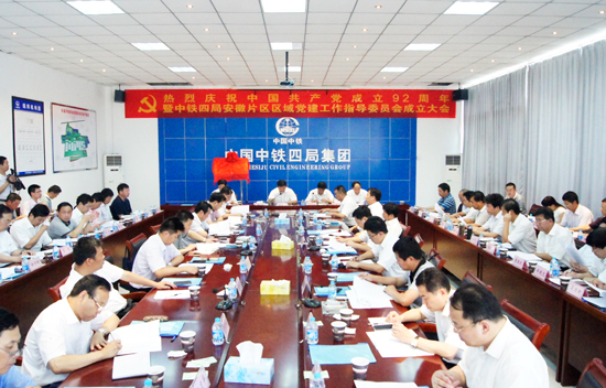 本报合肥讯 7月1日,局党委在一公司长临河制梁场隆重召开庆祝建党92周年暨安徽片区区域党建工作指导委员会成立大会。局董事长、党委书记张河川,党委副书记、纪委书记资宝成,工会主席段广和,副总经理汪志成等出席会议。资宝成主持会议。