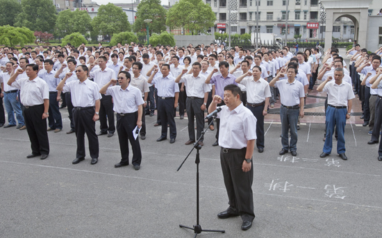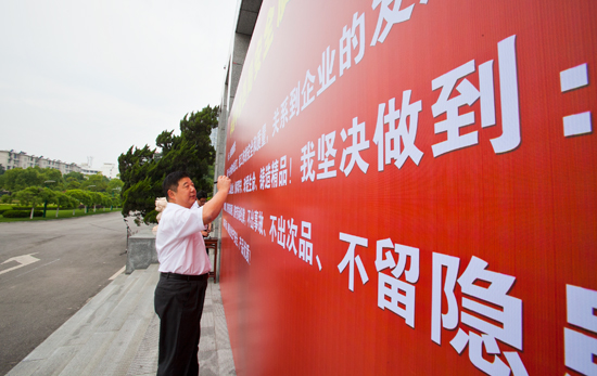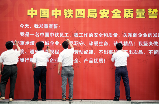 “我是一名中国中铁员工,我工作的安全和质量,关系到企业的发展和荣誉!我郑重承诺:忠诚企业、恪尽职守、珍爱生命、铸造精品!我坚决做到:遵守规章制度、遵守操作规程、遵守劳动纪律,不出事故、不出次品、不留隐患!我将以实际行动,确保企业生产安全、产品优质!”6月1日上午9时,在中铁四局机关举行“安全生产月”安全质量宣誓活动现场,局董事长、党委书记张河川带领局机关全体员工郑重宣誓承诺。局副总经理闫子才主持活动仪式,局工会主席段广和、局总会计师何文等在家的局领导参加宣誓仪式。全体参加活动人员在安全质量誓词牌上签名承诺。 (焦山 牛晓筠 路辉)