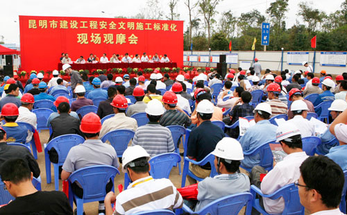 8月20日上午,昆明市建设工程安全文明施工标准化现场观摩会在中铁四局市政分公司承建的昆明轨道交通呈贡站工地隆重举行。局董事长、党委书记张河川应邀出席观摩会并做了经验介绍。云南省住房和城乡建设厅,昆明市国资委、发改委、建设局、监察局、文明办和昆明市各区县有关部门负责人参加会议。昆明市轨道交通公司、各建设监理单位代表共400多人参加了观摩会。