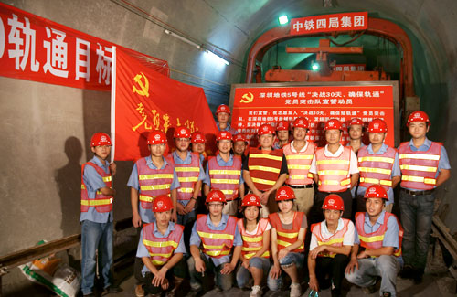 7月1日,为庆祝中国共产党成立89周年,中铁四局深圳地铁工程指挥部在六公司深圳地铁5号线铺轨项目部举行党员突击队授旗活动,以激发共产党员在“决战30天、确保730轨通”大干活动中的表率作用,为圆满完成决战任务目标提供有力组织保障。(王庆忠)