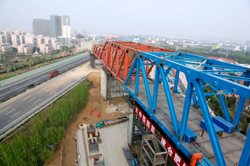 日前,由中铁四局钢结构公司承建的合肥铁路枢纽南环铁路钢桁梁柔性拱特大桥工程正在紧锣密鼓的施工中。该桥梁横跨合宁高速公路,是目前国内同类桥梁中跨度最大、柔性拱肋矢最高的铁路桥,同时该桥梁使用的不锈钢复合桥面板在铁路客运专线工程施工中首次运用。该工程预计2011年10月底完工,建成后将成为合肥市地标性建筑之一。(朱晓晨)