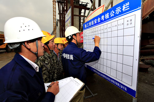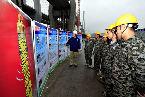 全国“安全生产月”活动期间,该项目部通过组织开展安全“三宝”技能比赛、观看安全警示教育展板、安全事故应急演练等形式多样的活动,提高工人安全生产意识,防范和遏制施工生产安全事故的发生。 (李旭 摄)