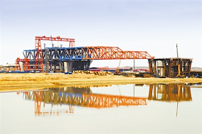 日前,由中铁四局集团承建的石(家庄)济(南)铁路客运专线重点控制性工程——齐济黄河公铁两用桥首孔重达776.8吨简支箱梁顺利架设。同日,主桥钢桁梁首节悬索加劲弦也顺利拼装。图为齐济黄河公铁两用桥主桥钢性悬索加劲连续钢桁梁顶推施工现场。李旭 毛恩波 王赛 摄