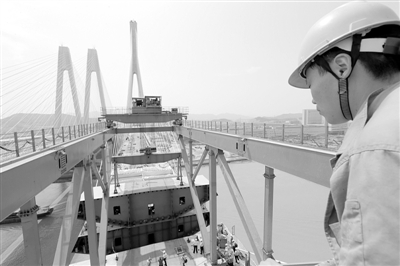 距离地面38米的上空,在两边主跨和边跨的结合处,都有一段长14.05米的钢混结合段。这个重达384.1吨的家伙,是整个桥体质量的关键点,也是施工技术中的一大创新点。