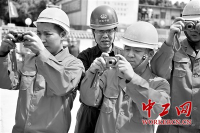 4月29日,合肥地铁1号线中铁四局工地现场,彭富川等农民工拿着刚刚发到手中的相机,小心翼翼地拍着工友。