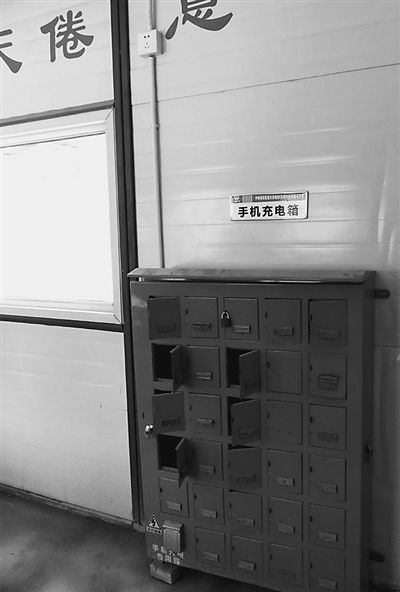 项目部专门购置了一台像报箱一样的柜式充电器,每个小箱子有钥匙,可供几十台手机同时充电。