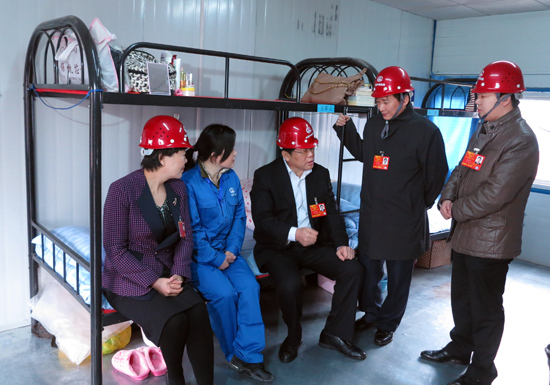 图为代表们在工地现场和宿舍与农民工亲切交谈。