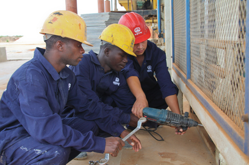 日前,中铁四局二公司安哥拉社会住房项目经理部员工杨红兵向2名安籍员工传授铆接技术。自开工以来,该经理部已经培育出能独立开展工作,适合施工现场技术合格的安籍骨干员工273人。(李旭 夏峰 摄)
