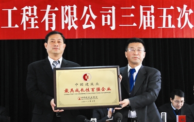 中铁四局建筑公司董事长、党委书记杨刚和总经理吴阿勤向与会人员展示中国建筑业最具成长性百强企业奖牌