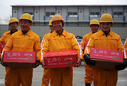 宜春(江西),2011年1月29日 为铁路一线“留守”工人送温暖 1月29日,坚守在沪昆客运专线江西段施工一线的农民工领到水果。 当日,中铁四局集团五公司为坚守在沪昆客运专线江西段施工一线的农民工送去水果、饮料和节日问候。为按期、高标准建设好沪昆客专,该公司1000多名职工和农民工春节“留守”工地,加快建设进程。 新华社记者周科摄