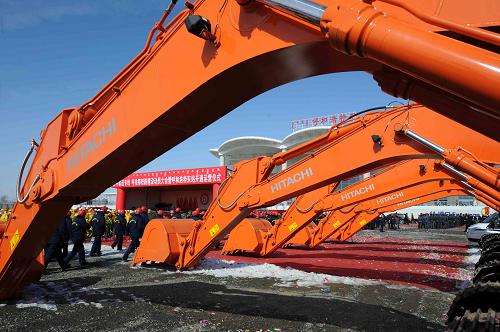 2月28日,大型施工机械在工程启动仪式上整装待发。当日,呼和浩特至张家口客运专线铁路工程在内蒙古呼和浩特正式启动。该客运专线东起河北省张家口市,西至内蒙古自治区呼和浩特市,全长286公里、建设工期4年,设计列车时速250公里,新建铁路将与京张城际铁路连接,构成内蒙古西部地区进京快速通道,建成通车后由呼和浩特到北京的时间将由现在的10多个小时缩短至2-3小时。新华社记者 张领 摄