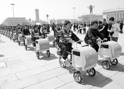 5月1日,环卫工人驾驶迷你型快速捡拾车进入天安门广场。当日,近百台迷你型快速捡拾车,在天安门广场投入使用。据介绍,这种快速捡拾车具备使用安全、速度可控、无炭环保等优点,其“流动垃圾桶”的特点,方便游客将垃圾随时丢到捡拾车的垃圾箱里。新华社记者 唐召明摄