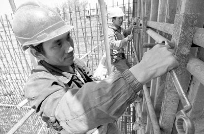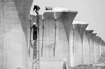 5月1日,中铁四局八公司工人在合蚌客运专线二标架梁工地工作。当日是“五一”国际劳动节,在国家重点工程合(肥)蚌(埠)客运专线二标架梁工地,中铁四局八公司的数十名架梁工人仍坚守岗位,加紧架设高铁桥梁。新华社记者 李健摄