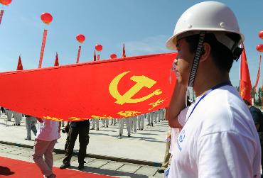 6月28日,中国中铁四局一名建设者手持党旗为党员进行建党89周年纪念。