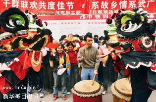▲2月7日,中铁四局职工为留守过年的农民工表演舞狮。受持续雨雪灾害天气影响,正在广州修建武广铁路客运专线新广州站及相关工程的中铁四局1000多名农民工无法回家过年。工地党组织组织了丰富多彩的文化体育娱乐活动,让留守农民工在工地度过一个祥和欢乐的新春佳节。 新华社发(李安容摄)