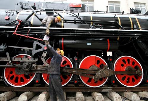 6月17日,工人在养护蒸汽机车。