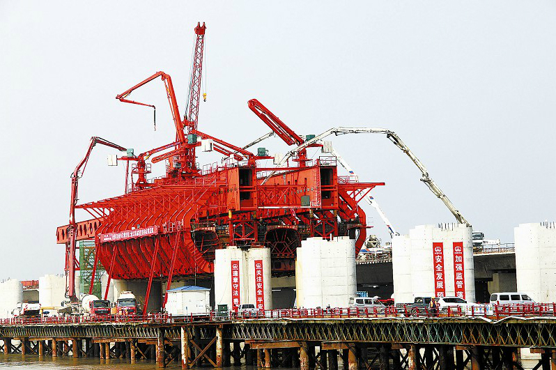 8月17日,中国中铁四局集团二公司员工在温州市域轨道S1线灵昆特大桥,利用自主研发的50米双幅上承式整体移动模架一次性成功浇筑首榀箱梁。(贡海斌 摄)