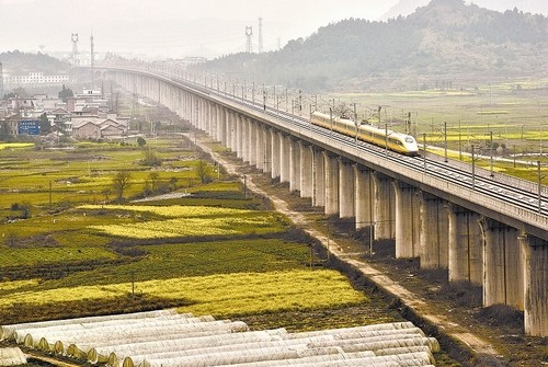 近期,CRH380A-001综合检测列车以300公里时速平稳驶过中国中铁四局集团沪昆客专江西段7标项目部承建的赵家里特大桥,联调联试工作进展顺利。图为综合检测列车通过赵家里特大桥。