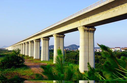 中国中铁四局集团杭长客专浙江段项目经理部克服征地拆迁难、联络线工期压力大、临近营业线施工安全风险高等困难,确定了铺轨施工推进计划,在确保安全质量的前提下,不断加快施工进度。截至目前,项目经理部正线施工已完成设计总量的98%,无砟轨道施工已完成工程总量的45%。图为杭长客专义金特大桥雄姿。 (李旭 摄)