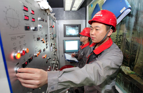 12月31日,为营造良好的学习氛围,中国中铁四局二公司成都地铁4号线项目经理部开展师徒结对子活动,帮助见习生提高业务能力。图为项目部盾构司机和见习生正在操作盾构机。(李旭 摄)