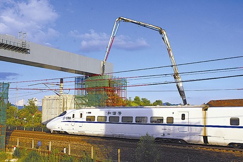 由中国中铁四局集团二公司承担的金华至温州铁路扩能改造工程1标段8.5万立方米高性能混凝土集中拌和供应进展顺利。截至3月5日,该公司已完成混凝土供应7万立方米。为优质高效地完成供应任务,该公司制定了行之有效的安全质量管控措施,对地材验收、混凝土出产质量严格执行相关制度,确保工程顺利进行。图为一趟列车安全通过施工现场。(龙杰 摄)