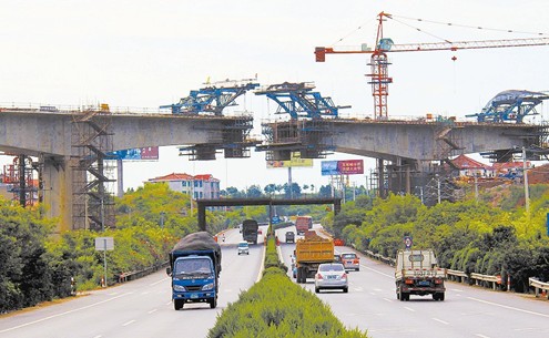 7月7日,中国中铁四局集团金温指挥部大型塔吊正在金 (华)温(州)铁路扩能改造工程1标段东阳特大桥跨330国道处进行连续梁施工,目前工程进度稳步推进。金温铁路扩能改造工程是国家重点建设项目和浙江省“七线两枢纽”铁路建设重点项目之一。图为施工现场。 (龙杰 摄)