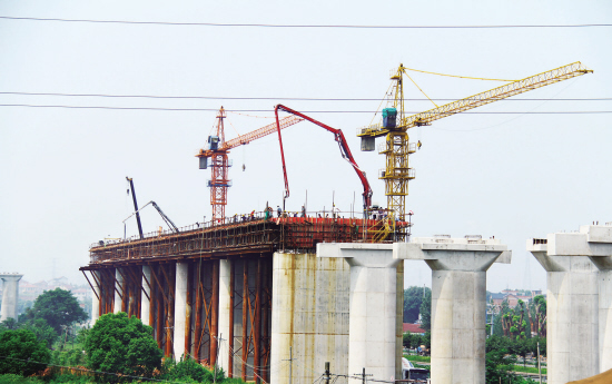 跨沪昆铁路特大桥位于金东区塘雅镇境内,全长为2.5公里,施工区域周边临近正在运行的沪昆、金温铁路线,存在着施工安全管理困难多、周期长等情况。此次浇注的道岔连续梁共5跨,全长为166.7米,浇注混凝土1472立方米,成功浇注后,为完成节点工期奠定了基础,同时也标志着金温铁路线第一孔现浇道岔梁顺利浇注完成。