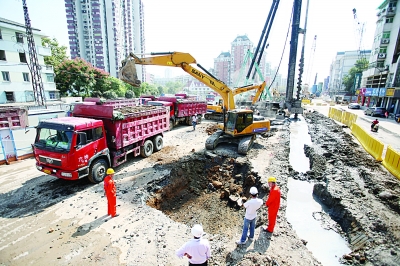 根据城西干道改造方案,全长6.13公里的改造路段北起古平岗立交,全线共设4座下穿隧道,终点接赛虹桥立交。扬子晚报记者昨天在城西隧道水西门段看到,两台挖机和高高耸立着的三轴搅拌桩都已经开始工作,和以往这些大型机械都位于城西干道东西两侧进行隧道支护桩施工不同,此次大型设备正式移至马路中央,这也预示着隧道主体开挖工作的正式展开。
