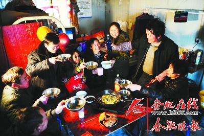 除夕,留守工地的老乡们聚在一起吃团圆饭