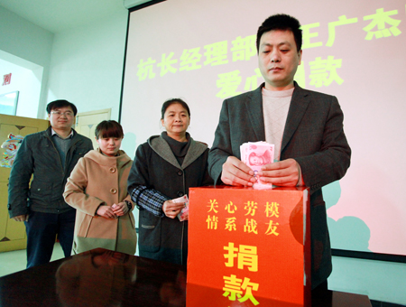 王广杰今年45岁,是全国“五一”劳动奖章获得者,在参加杭州湾跨海大桥施工时,荣获过“浙江省劳模”称号。不幸的是,他患上了急性髓性M1型白血病,已花去100多万元医药费,还需要近100万元后续治疗费用。该经理部为此向全体员工发出倡议。王广杰接受骨髓移植手术后,亟须的AB型血小板紧缺,15名符合要求的职工共捐献血小板150个单位。截至目前,收到5个分部340余名员工、家属的爱心捐款近4万元。