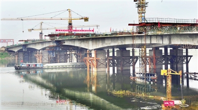 漳河大桥全长735米,主桥长315米,桥宽45米,为双向4车道,分左右幅施工,计划工期2年。自去年2月工程建设开工以来,市公路局、中铁四局二公司等建设、施工方,克服雨水天气多、漳河河水上涨等不利影响,连续奋战15个月,确保工程建设的各节点项目按时序进度推进。