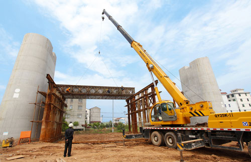 昨日,在位于义乌市上溪镇中铁四局承建的杭长客运专线义金特大桥跨03省道连续梁施工现场,吊车正在配合施工人员安装贝雷架。