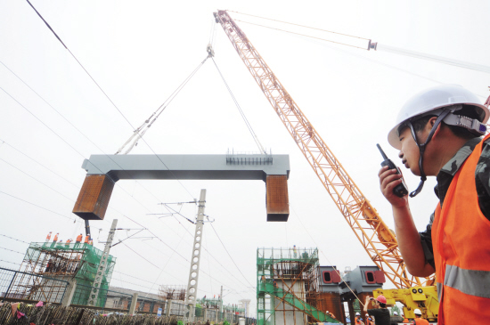 昨天下午1时50分,在金东区塘雅镇竹溪塘村附近,随着一声哨响,一辆500吨的吊机将重约130吨的钢盖梁缓缓吊起,中铁四局金温铁路扩能改造工程联络线跨沪昆铁路特大桥的第一跨钢盖梁开始吊装。