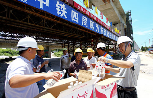 昨天上午,在义乌市仙田村附近的杭长客专义金特大桥畈吴线连续梁施工现场,中铁四局管理人员给冒着酷暑施工的建设者送去了矿泉水。