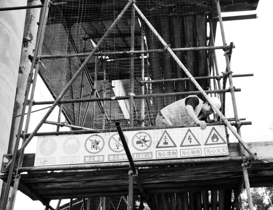 受台风“海葵”的影响,我市风雨大作。为了防止施工现场发生意外,昨天上午8时许,中铁四局金温扩能改造工程指挥部立即启动应急预案,总工程师及安全总监冒着风雨赶往施工现场进行巡查。检查中发现,悬挂在桥墩上的安全标志牌因受台风影响,已经摇摇欲坠,存在很大的安全隐患。安全总监立即叫来现场值班人员,在做好安全防护的情况下,爬上桥墩把安全标志牌取下。(记者 时宽兵 通讯员 潘新 文/摄)