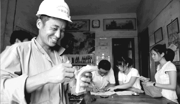 新学年即将开学之际,中铁四局杭(州)长(沙)客运专线项目部优先保障农民工工资按时、足额发放,使农民工子女在新学期都能顺利入学。图为该公司安徽籍农民工占世杰在高兴地清点刚刚领到的工资。 (通讯员 曹振华 李旭 摄影报道)