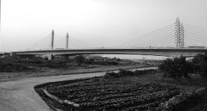 本报讯 近日,由中铁四局二公司上海大芦线项目部(简称项目部)施工的上海大芦线航道整治1期项目11标段跨河斜拉桥工程全部完工。该工程位于上海市南汇区惠南镇大芦线泐马河航段内,主要包括新建一座双塔双索面矮塔斜拉桥。该斜拉桥全长554.88米,主桥长235.92米,桥宽31.7米,塔高20米。每一个索面有9根斜拉索,共有72根斜拉索。另外,该整治项目还包括桥下航道整治工程、护岸工程和桥梁两侧连接道路工程。
