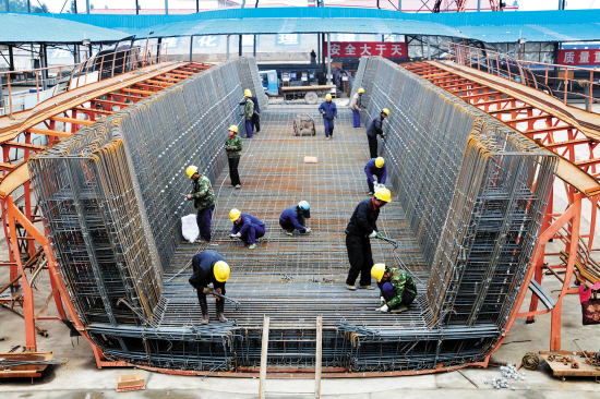昨天,在中铁四局杭长线浙江段金东制梁场,员工正在紧张有序地进行箱梁梁体钢筋绑扎作业。连日来,随着铁路建设资金紧张局面缓解,物资逐步供应到位,该梁场迅速掀起生产高潮。截至目前,该梁场共计完成32米箱梁预制395孔。 (记者 时宽兵 通讯员 李旭)