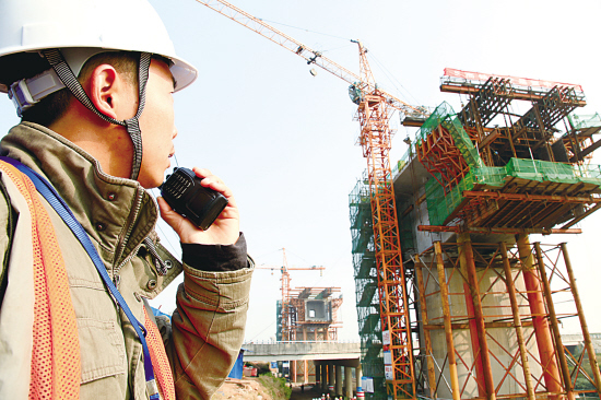 昨日,在中铁四局杭长线金义特大桥跨沪昆铁路、甬金高速公路连续梁施工现场,安全防护员张晨克使用对讲机通知塔吊司机,5分钟后有列车通过,停止吊装作业。
