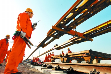 11月29日上午,石武客专河南段开始机械化铺轨。 本报记者 李建峰 摄
