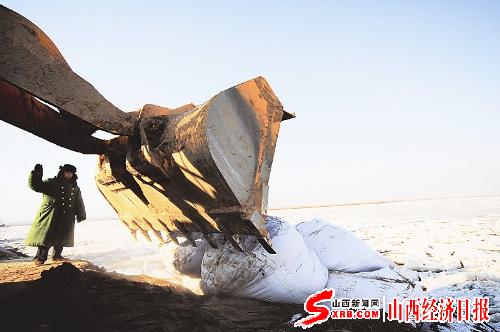 1月5日,大西铁路客运专线晋陕黄河特大桥的施工人员正在加固堤坝,防止黄河流凌对施工造成影响。针对近期寒冷的天气情况,中铁四局采取多项措施切实加强防凌工作,确保晋陕黄河特大桥施工安全。