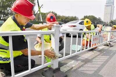 本报讯(郑报全媒体记者 白韬 文/图) 新中国70华诞来临之际,中铁四局地铁绿城广场站工作人员从守好保通路入手,开展形式多样的活动,营造喜庆氛围。图为绿城广场站组织文明施工队对中原路中央护栏进行清洗,以保证保通路的整洁,美观。