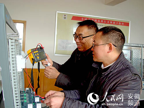 全国劳动模范翟长青(左一)给青工讲解电机知识