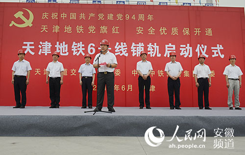 人民网讯 6月25日,天津轨道交通集团与中国中铁四局在天津地铁6号线外院附中站铺轨基地隆重举行“天津地铁党旗红 安全优质保开通”党建主题活动暨天津地铁6号线铺轨启动仪式。天津市建委总工程师、市轨道交通工程建设指挥部副总指挥翟家常,天津轨道交通集团党委书记、董事长苗玉刚,党委委员、副总经理张兴彦,天津轨道交通集团地铁公司党委书记陈福兴,地铁公司副总经理、第三建管中心党总支书记殷波,中国中铁四局董事长、党委书记张河川,局党委副书记、纪委书记袁敏,局总经理助理耿树标,以及参建单位干部员工代表150多人参加了启动仪式。活动仪式由天津轨道交通集团党委副书记黄琦主持。