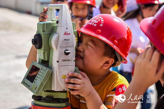 在工作人员的指导下,孩子们争抢着体验全站仪