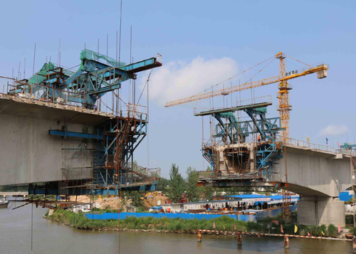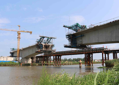 中国日报网江苏频道8月13日电 2015年8月13日,记者在连盐铁路跨盐河特大桥施工现场看到,大桥连续梁双向同步推进即将合拢。