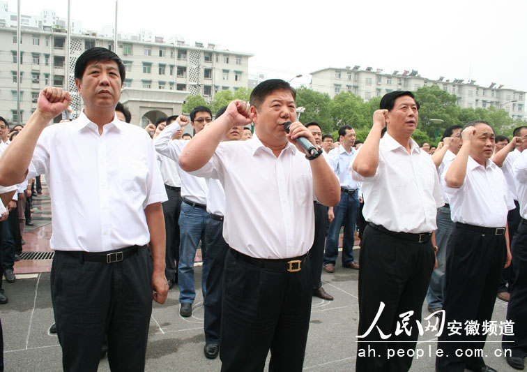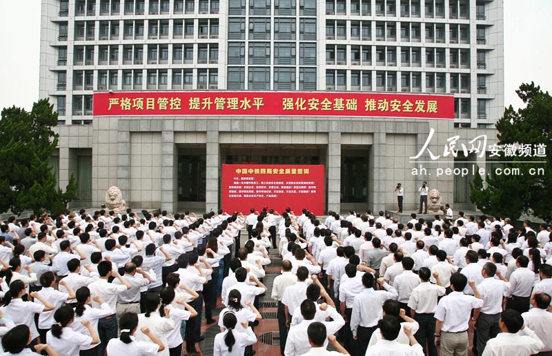 “今天,我郑重宣誓:我是一名中国中铁员工,我工作的安全和质量,关系到企业的发展和荣誉!我郑重承诺:忠诚企业、恪尽职守、珍爱生命、铸造精品!我坚决做到:遵守规章制度、遵守规范规程、遵守劳动纪律,不出事故、不出次品、不留隐患!我将以实际行动,确保企业生产安全、产品优质!”5月31日上午,在合肥中铁四局机关“安全生产月”安全质量宣誓活动现场,中铁四局董事长、党委书记张河川带领机关约350名干部职工庄严宣誓。资宝成、段广和、何文、闫子才、王砚才、耿锦、刘勃等领导也参加宣誓活动。宣誓结束后,中铁四局机关参加宣誓的干部职工在安全质量誓词牌上承诺签名。与此同时,中铁四局33个子(分)公司和413个项目经理部共约19170名干部职工,在单位驻地同步进行宣誓活动。安全质量宣誓活动的举行标志着中铁四局“安全生产月”活动正式启动。